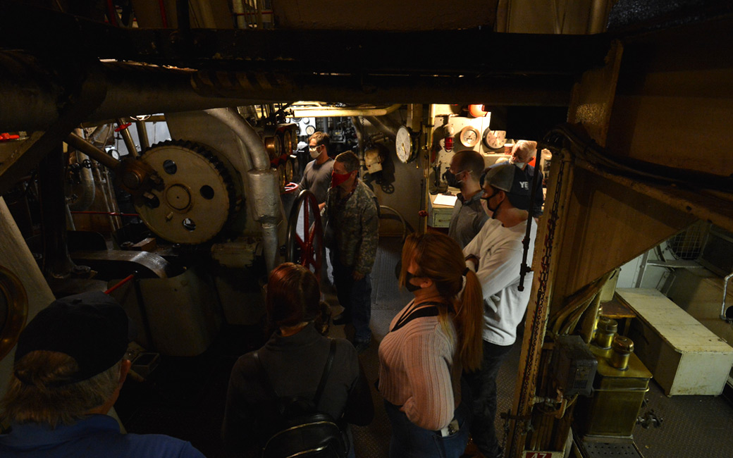 After a brief lecture and small demonstration inside the John Brown—using a pressure cooker to generate steam—the group split in two for separate demonstrations. The first group went further below deck to see the ship’s engine, while the second group went on deck for a different demonstration.