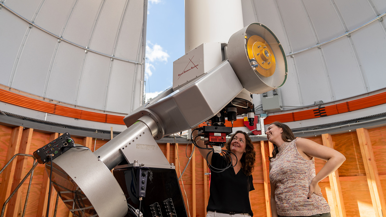 Scott and Markward, shown with the telescope found the TU Observatory, have done research together at the Green Bank Telescope, a 100-meter radio dish located in Green Bank, West Virginia.