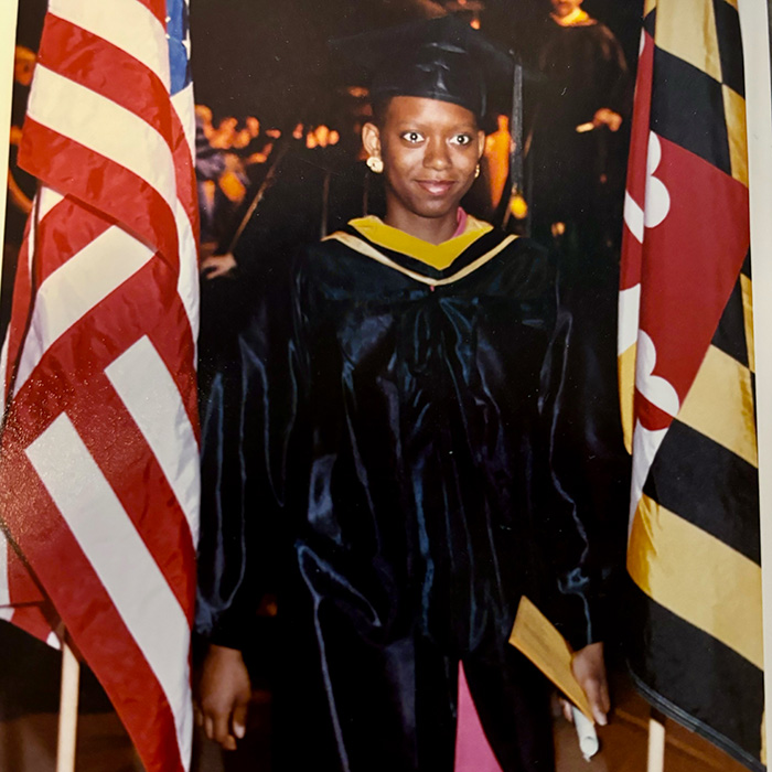 Our wedding was in Prince George’s County where we both grew up. We had the ceremony and reception at a Holiday Inn. We had great food and a great time with friends and family dancing and partying. I remember people were questioning, “Is this ever going to happen?” We had gotten engaged in 1990 but didn’t get married until 1996. After Desert Storm and we graduated, we both went away to different grad schools.