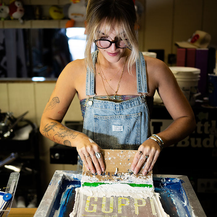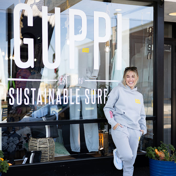 Born from her love of the ocean, surfing and her passion for environmental consciousness, Guppi is a surf company that produces apparel and accessories with sustainable materials such as bamboo, organic cotton and hemp. All screen printed and embroidered items are handmade by MacQueen.