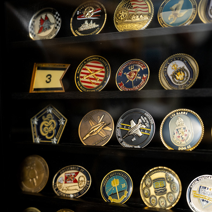 “Part of the lore is that somebody gives you a challenge coin from their unit and, if you don’t have one to give back to them representing your unit, you owe them a drink,” he says. “Ship’s captains, squadron commanders, admirals, they would often give briefers a challenge coin as an expression of thanks for our service to them at that particular moment.”