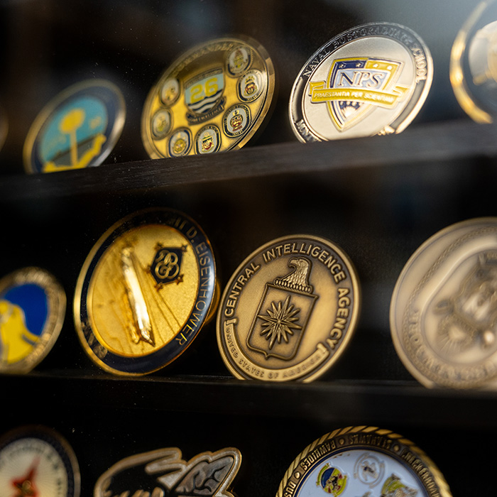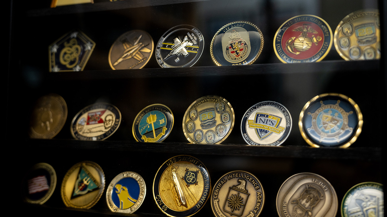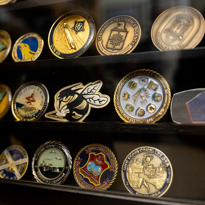 Tucked in the back corner of Rook’s office is a shadow box displaying coins of varying shapes and sizes. Called challenge coins, their designs represent the military units who create them, and they are meant to be traded among military members.