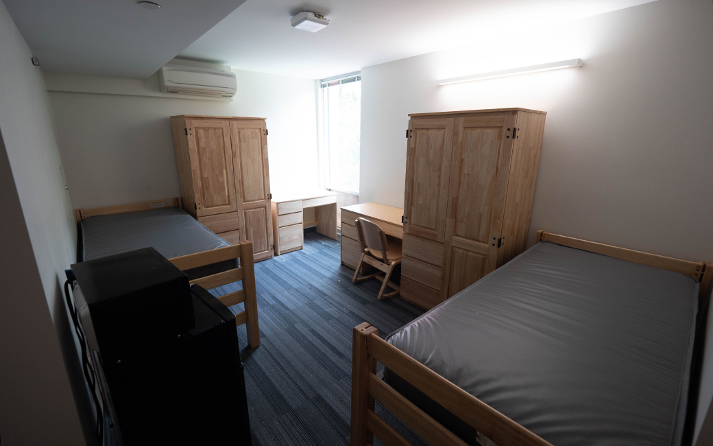 - each bedroom is furnished with extra-long twin beds, wardrobe, dresser, desk and a chair per student